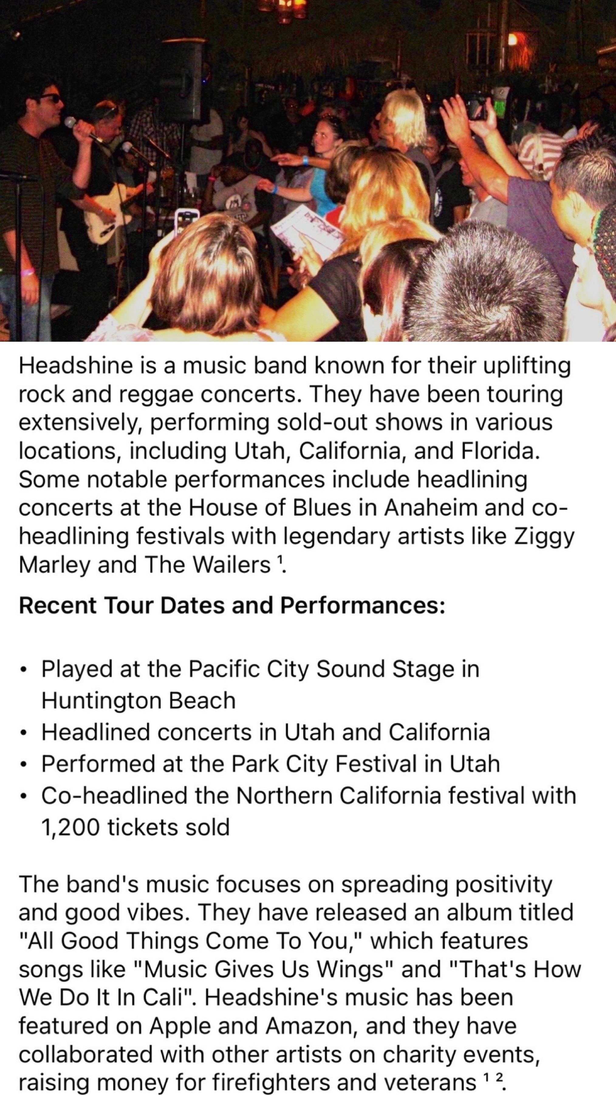 Much like the typical native Californian, Headshine is a musical mosaic of melodies effortlessly melting into each other, supported by luminous lyrics prompting the listeners towards self-compassion and positive action. This sound transmuted into feeling is the kind of experience that has prompted many a youthful daydreamer into finding their own dreams with the peaceful churn of the Pacific Ocean as their soundtrack." 106.7FM KROQ "Headshine is a rock and reggae band from Southern California, that is known for their uplifting and positive music. The bands music is a fusion of rock, reggae and acoustic sounds, creating a unique and energetic vibe. Headshine has performed at various venues and festivals, including the House of Blues, Belly Up, and the Sundance Film Festival. They have also shared the stage with notable artists such as Ziggy Marley, The Wailers and The English Beat. With a growing fan base and a string of upcoming shows, Headshine is definitely a band to watch out for. Their music is available on various platforms including Amazon, Apple and Spotify." Meta "Headshine is a band that not only brings you amazing live music, but uses their platform to give back to the community." Backstage photo at Headshines sold out show benefiting Huntington Beach Surfing Museum thanks to Pacific City, Locale Magazine